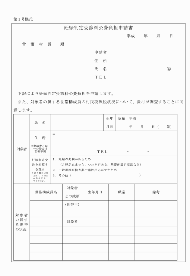 第6条 公費負担を希望する者は、村が対象者の属する世帯の課税状況について調査を行うことを同意する旨を記載した「妊娠判定受診料公費負担申請書(第1号様式)」を村長に提出するものとする。
