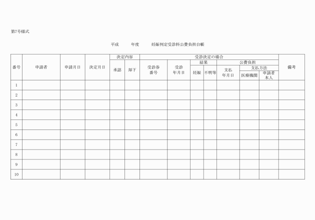 第11条 村は、公費負担の状況を明確にするため、「妊娠判定受診料公費負担台帳(第7号様式)を整備しておくものとする。