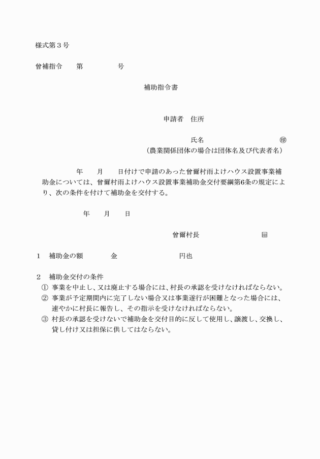 第1条 村長は、農業振興を積極的に推進するため施設野菜栽培を行おうとする農業者及び農業関係団体に対し、雨よけハウス施設(以下「施設」という。)設置に要する経費について予算の範囲内において補助金を交付するものとし、その交付に関してはこの要綱に定めるものとする。
