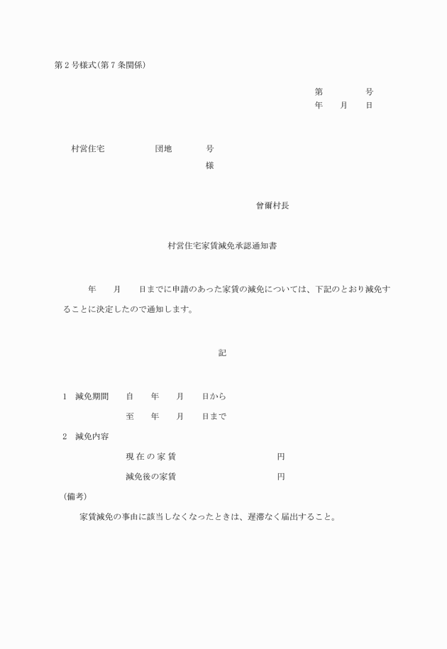 2 村長は、家賃の減免を行う必要がないと決定したときは、村営住宅家賃減免不承認通知書(別紙様式3)により当該申請者に対し通知する。