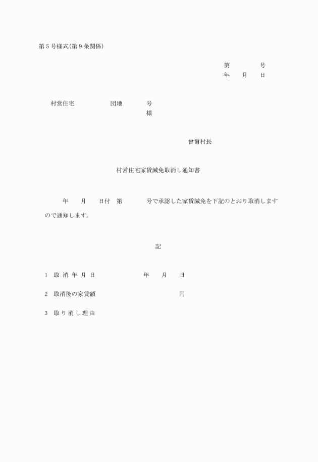 第10条 村長は、減免の承認を受けている者に対し、減免期間の終了を終了期日の30日前までに、村営住宅家賃減免期間終了通知書(別紙様式6)により通知する。